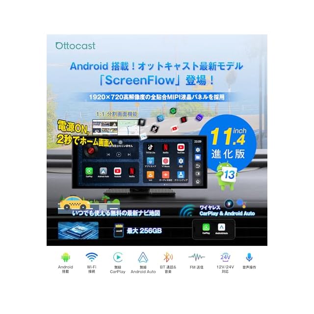 商品名:【公式】オットキャスト ポータブルディスプレイオーディオ OTTOCAST ScreenFlow 11.4インチ ワイヤレスCarPlay/Android Auto対応でYouTubeやNetflixも視聴可能 androidナビ 音楽/通話/音声操作(Siri/Google) Bluetooth/AUX/FM 2画面分割 取付け簡単 技適取得済 TFカード対応 オンダッシュモニター