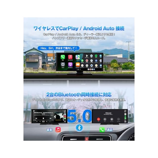 【ワイヤレスCarPlay&Android Auto対応 + デュアルBluetooth搭載】 iPhoneやAndroidスマホとBluetoothで接続するだけで、Apple CarPlay / Android Autoがワイヤレスで使用可能。ナビゲーション、通話、音楽再生、メッセージ、天気予報などのアプリがすぐにディスプレイに表示され、操作はスマホを触らず音声で完了!SiriやGoogleアシスタントに話しかけるだけでルート案内や電話発信も可能です。さらに、デュアルBluetooth搭載により、スマホと本体、そして車載スピーカーへ同時接続可能。無駄なケーブルを使わず、美しい車内空間と快適な音楽体験を両立します。