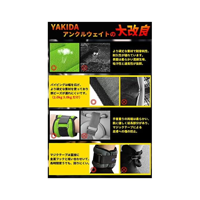 【均一で高密度の鉄ビーズ】アンクルウェイトの重さを均等に6分割するように縫製しており、運動中にもアンクルウェイトを均一な負荷を保つことができ、変形にくく、使用感抜群です。リストウェイトの内材が高密度な鉄ビーズを採用し、小さな鉄のビーズは、体の形により正しく調整することができ、フィットが良いです。