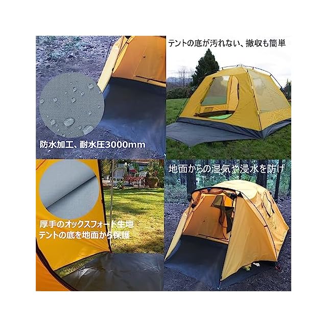 【湿気や浸水を防ぐ】両面の撥水加工を採用し、耐水圧3000mmのPUコーティングを施して、地面からの湿気や浸水を防げるので、テント内で快適に過ごせます。テントシートの縫い目にシールテープ防水加工を施し、雨のキャンプでもテント底面が濡れるのを防いでくれます。