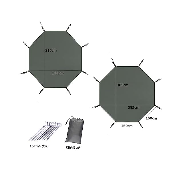 【製品仕様】八角グランドシートのサイズ:385x350cm;385x385cm;ペグ8本と収納袋つきです。折りたためばコンパクトに収納できます。八角形のグランドシートはワンポールテントにぴったりの形状です
