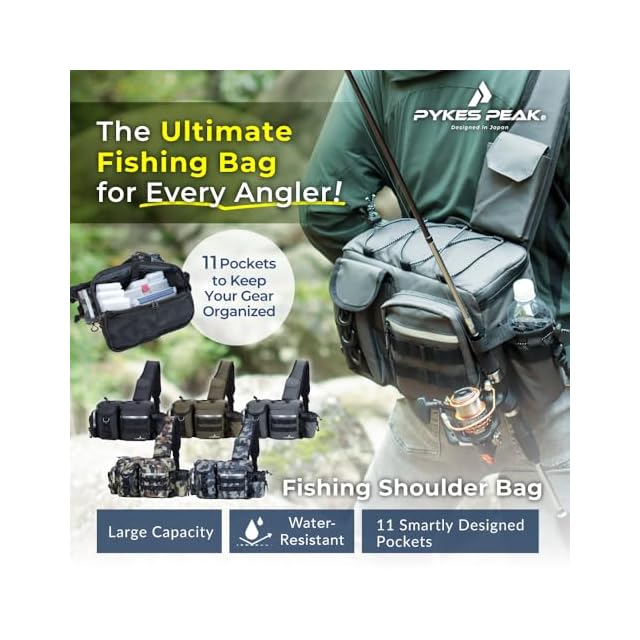 PYKES PEAK (パイクスピーク) 釣り バッグ フィッシングバッグ タックルバッグ ランガンバッグ 2サイズ 5色 防水ジッパー 大容量 カラビナ6個 フィッシングショルダーバッグ Lサイズ (カモグリーン)