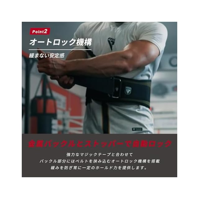 【緩まないオートロック式バックル】バックルにベルトを挟み込む構造で、力を入れてもズレにくい設計。ウェイトリフティングやジムトレーニングで高重量を扱う場面でも安心です。