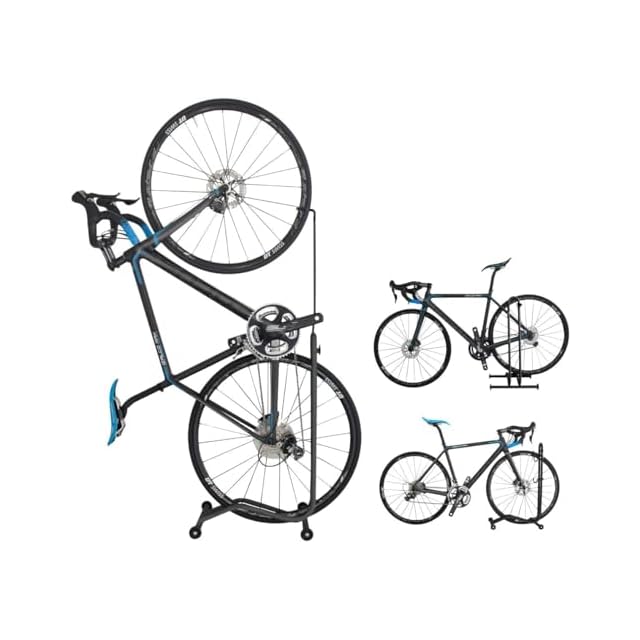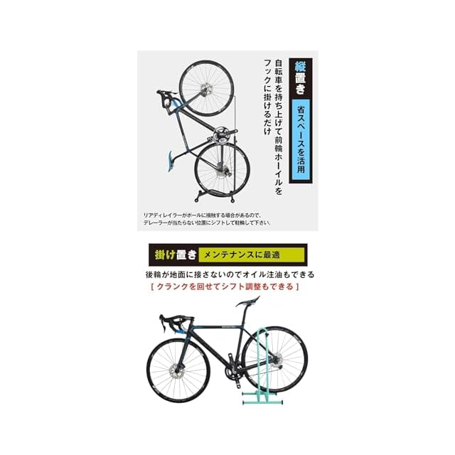 本製品はタイヤ幅65mm以下、20-29インチ、ホイールベース1m以上のスポーツ用 二輪自転車に適用の駐車スタンドです。購入前に自転車のサイズを確認してください。 本製品構造のため、縦置き時、リアディレイラーがポールに接触する場合があるので、 縦置き時はデレーラーが当たらない位置にシフトしておく必要があります。 縦置き使用の際は御注意ください。必ず水平で安定した場所でご使用ください。 転倒事故防止のため、特に縦置きで使用する場合は十分バランスに注意してください。 安定性を持つため、最大荷重25kg (20kg以下が推奨です)になります。 ホイールベースの長さは1m以上の車種(20-29インチ)に対し、前輪フックは 右側面から“時計の4時”位置が安定です。位置が低すぎると自転車が前後に傾きや すくなってしまい安定性が損なわれます。又高過ぎると装着しづらくなります。