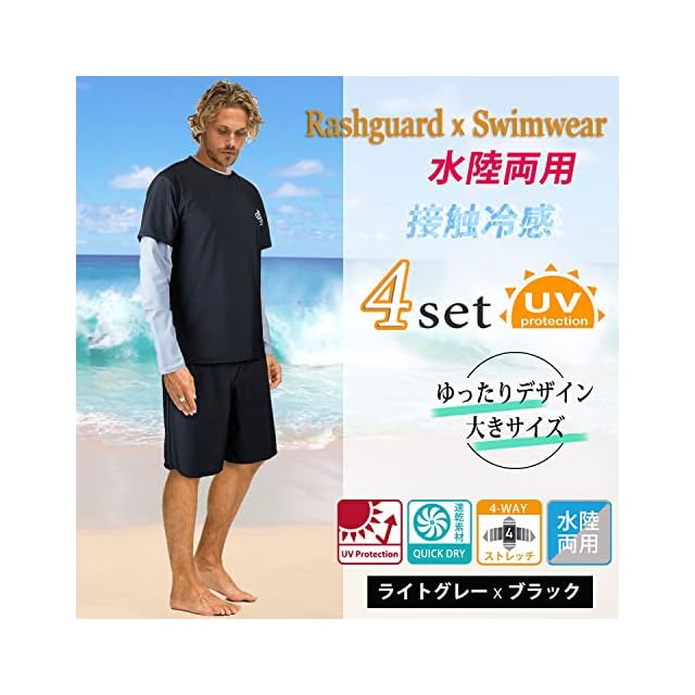 【ARMOTO】ラッシュガード メンズ 水着 長袖 パーカー レギンス サーフパンツ フィットネス 豪華四点セット[UVカット UPF50+・吸汗速乾] 水泳 水陸両用 大きいサイズ