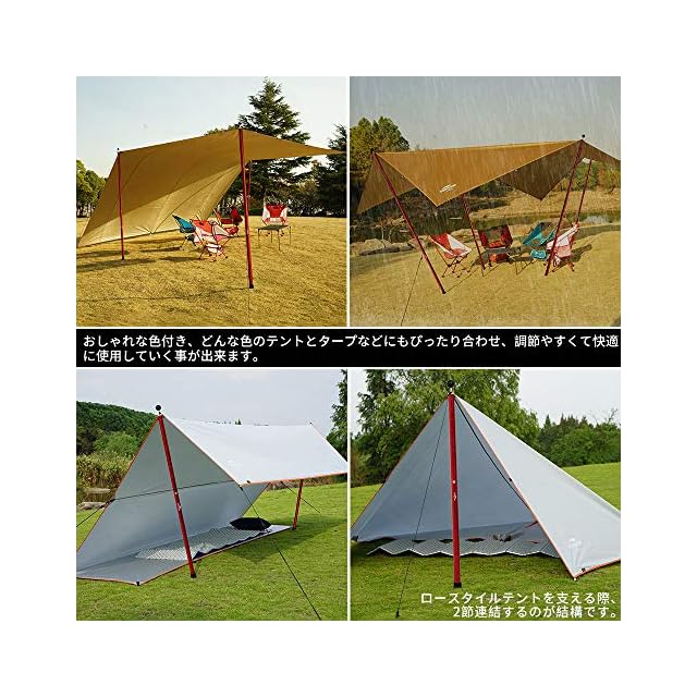 分割式ポール+プッシュアップトップ節:4節連結タイプで長さ調整範囲が120cm~280cmの間で27段階まで長さがアレンジできます。 連結本数によって60cmごとに長さ調節可能、120cm・180cm・240cm三段階とプッシュアップトップ節によって5cmごとに長さ調節可能、5cm+5cm+5cm+5cm+5cm+5cm+5cm+5cm八段階で自由に伸縮可能、数多い段階で長さを選べます。ポールの高さと低さを簡単に調整して高低差を作って防雨・防風対策にアレンジできます。