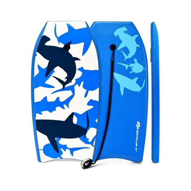 GYMAX ボディボード リーシュコード付き マリンスポーツ XPEデッキ&EPSコア 初心者向け メンズ レディース 子供用 大人用 3サイズ対応 軽量 安定 滑り止め加工 ビーチ・プール・水泳 夏休み大活躍 海水浴 (青いサメ, M-37インチ)