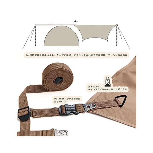 【スペース使用率の向上】:延長ベルトの設計で、テントと組み合わせて使用することができ、テントの前室の使用空間に影響することなく、天候の変化に対応できます。タープの両端の内側には三角リングがついているので、これにロープを通して、個人の持ち物やキャンプランプを吊るしやすくなり、キャンプ時間を楽しましょう。