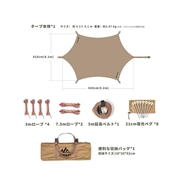 Unigear ヘキサタープ tcタープ ポリコットン 5m延長ベルト付き 4.2mx4.1m テントとの取り組み可能 焚き火 タープ 遮光 遮熱 難燃 軽量 コンパクト キャンプ アウトドア (420*410cm, カーキ)
