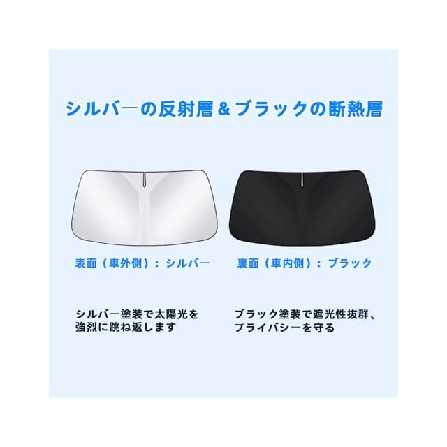 ♪【長持ち高品質素材】①表面:表面には日射しを反射するシルバーコーティングを施し、優れた遮熱効果を実現、温度の上昇を抑え、お肌に有害な紫外線もカット。車内の内装やシートの劣化、熱変形なども防きます。②裏面:落ち着いたブラック生地で車内でゆっくり仮眠や食事をとりたい時にも活用できます。また、長時間車を駐車するときに車内を見えないようにすることで、車上荒らし対策にもなります。