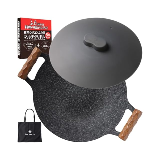 Far North マルチグリドル 33.6cm 【軽く割れずピタッとゼロ収納の蓋付き5点セット】 (本体、シリコン蓋、高級木製グリップ、収納バッグ、レシピ冊子) 特殊コーティング IH対応 GRIDDLE KING グリドルキング 軽量アルミ合金製 750g