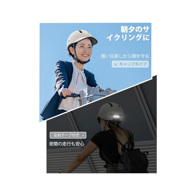 【朝夕のサイクリングに】ヘルメットはキャップタイプで強い日差しを防ぎ快適に使えます。ヘルメットの後ろには反射テープがあり、あごひもにも反射材が使われています、視認性を向上させ、夜道も安全です。安全と快適さを纏う、軽やかな都市型ライディングを