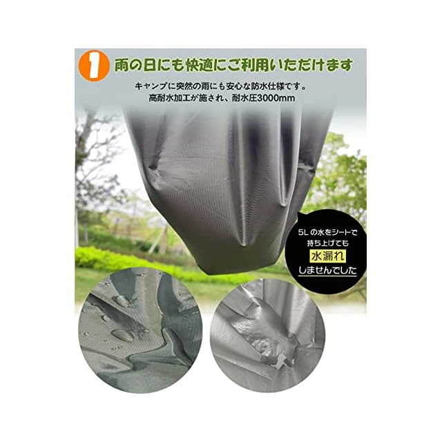 【高い防水性テントシート】こちらのテントシートは210D引き裂く防止のオックスフォードを採用し、シートの裏面はシルバーコーデイング加工が施されていて、PU3000mmの高い耐水圧機能を備えた製品です。濡れた場所にも使えるテンドシートです。
