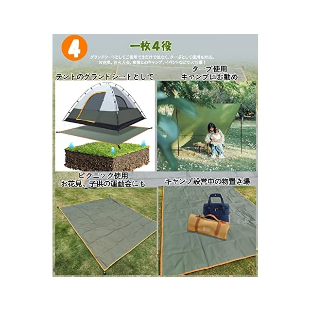 【幅広く応用できるレジャーシート】桜の季節、お花見、ピクニック、紅葉狩り、花火大会、運動会、浜辺に最適。グランドシートをテントの下に敷くことでテントの底に汚れや傷などがつくのを防げます。または、急な雨に雨宿り、防災用品として常備してていただけます。