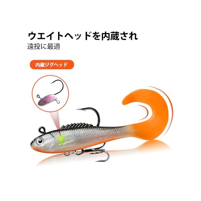 【鋭いフック・オモリ付き】このルアーはシャープなジグヘッドを装備しており、科学的なオモリでルアーを横に反転させることなくて、水中でキープするだけでなく、オモリブロックに蛍光コーティングが加えられているため、薄暗い状況でもルアーが蛍光して魚を誘うことができる。