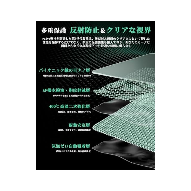 【抜群な反射防止・鮮明な視界】弊社の ヴェゼル rv ガラスフィルム はバイオニック蛾の目仕組みと最先端技術を融合し、自然界の反射防止メカニズムを完璧に擬する反射防止フィルムです。これによってさまざまな環境での運転中にも、ナビゲーションの視覚がこの上もない反射防止機能を持ち、同時に見やすさも損なわれていない。日中や夜間の映り込みによる視界の妨げに悩むことはもうありません。アンチグレアフィルムが好きな人に絶対におすすめです。