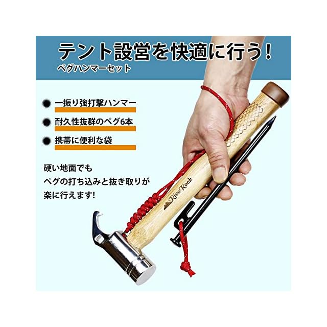 RiveRock(リバロック) ペグハンマー 収納袋 安全キャップ付き ペグ10本 夜光ロープ 強靭 (ハンマー+ペグ10本+収納バック/レッド)