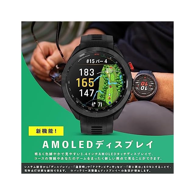 ・世界中の43,000以上のコースがプリインストールされています。・自分のパフォーマンスや風の状況に合わせて、どこを狙い、どの番手を打てばいいのかを知ることができます。・進化したPlaysLike距離(高低差情報)機能で、アプローチがさらにイメージしやすくなります。・24時間365日のヘルスモニタリングとアクティビティトラッキングで、トレーニングの成果を常に把握できます。・スタイリッシュな軽量ボディにセラミックベゼル採用で、ゴルフ中も日常シーンも快適に使用できます。