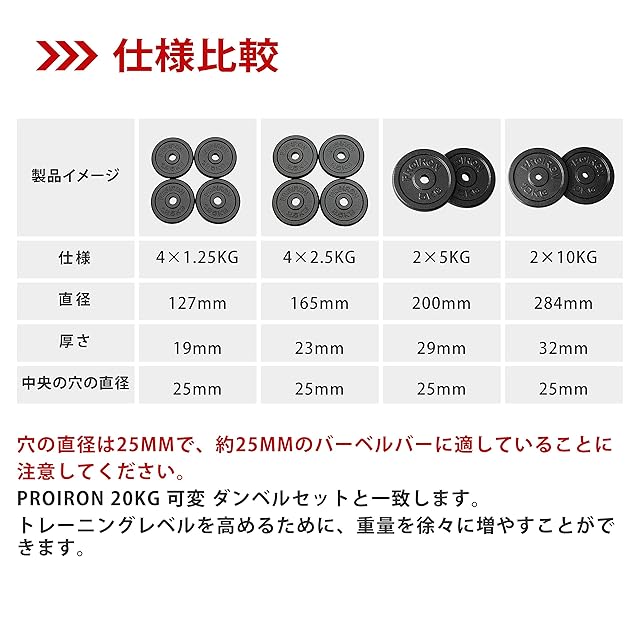 PROIRON ダンベル プレートバーベル プレート 2.5kg×4個 鋳鉄製 トレーニングバンパープレート 穴径25mm