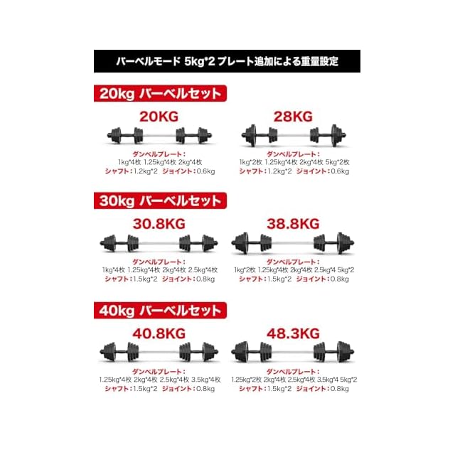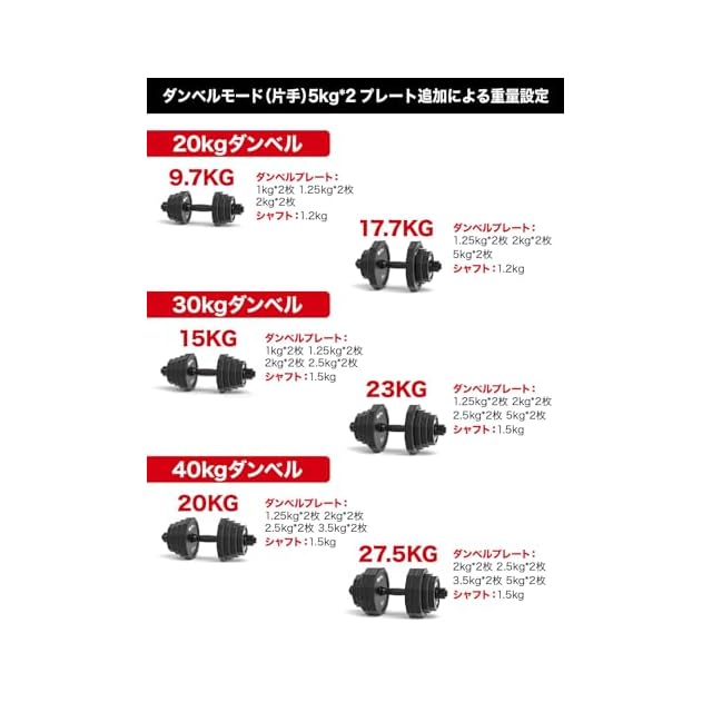 20KGスチール製ダンベルには、片方に最高3枚のプレートをセットできます。30KG/40KGスチール製ダンベルには、片方に最高4枚のプレートをセットできます。