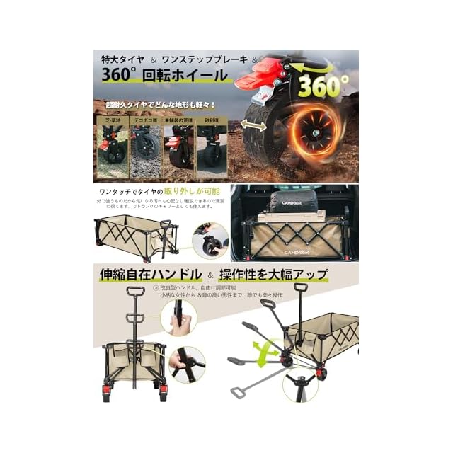 【全地形対応タイヤ+ワンプッシュブレーキ】特大タイヤ、360°回転ホイールを備えたキャリーカート 4輪モデル。幅広タイヤで、砂利道・悪路・坂道でも安定走行。ワンプッシュブレーキ搭載で、15度の傾斜でも安全に停止。大型タイヤは取り外し可能で、車内清掃も楽々。キャンプ キャリーワゴンとしても高性能を発揮します。