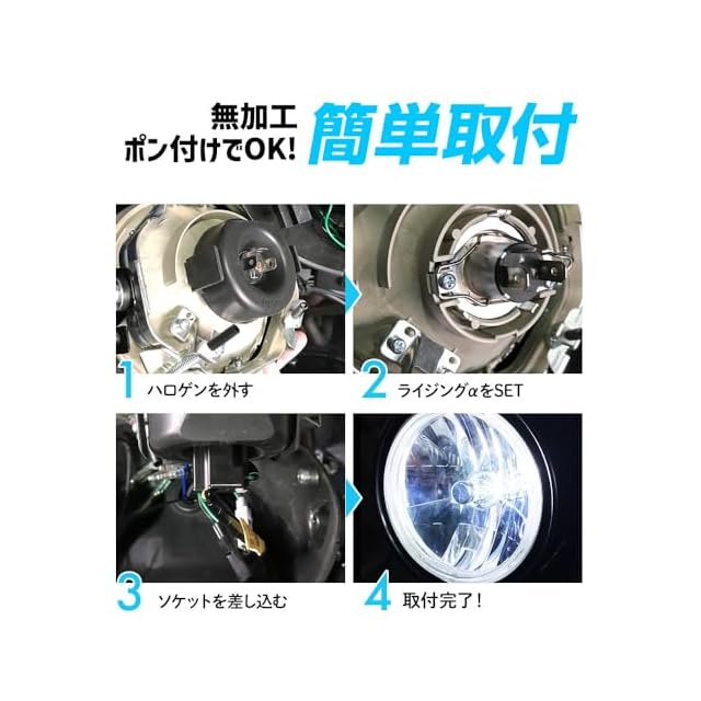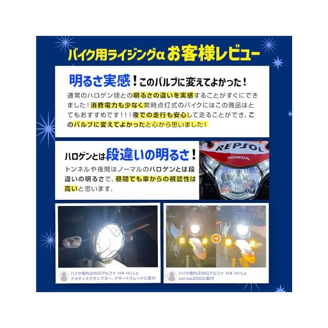 【製品仕様】商品名:バイク用RIZINGα Pro(ライジングアルファプロ)、形状:H4 Hi/Lo、明るさ:5000lm、カラー:6000K(ホワイト)、対応電圧:DC12V、消費電力:24W、入り数:1本、:お買い上げより3年間