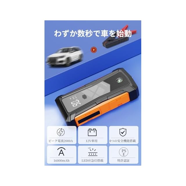 ジャンプスターター 12V車用 【2025革新・独創デザイン】 エンジンスターター ピーク電流2000A 車緊急始動 最大7.0Lガソリン 2Lディーゼル車対応 モバイルバッテリー機能 安全保護機能搭載 LED緊急ライト搭載 羅針盤 緊急破窓機能 PSE認証済み (オレンジ,16000mAh)
