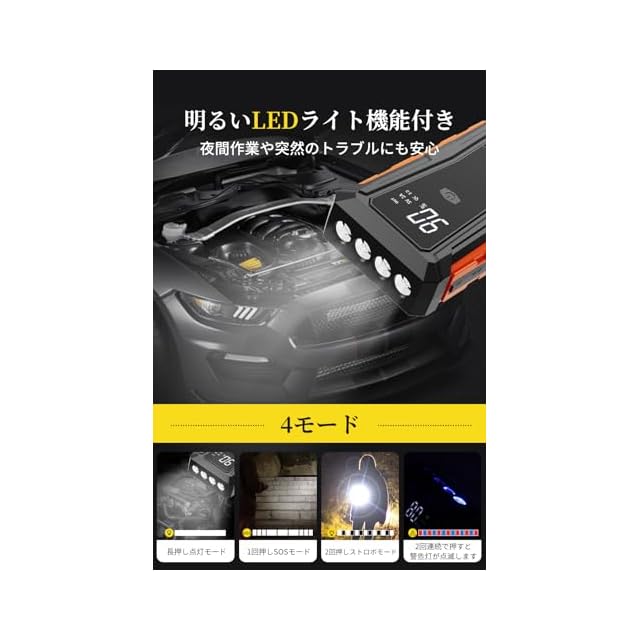 【4灯光モード&多車種対応】四つの照明モード(常灯、SOS、ストロボ、赤青警告灯)を搭載。ガソリン車、ディーゼル車、トラック、バイク、軽自動車など、幅広い車種に対応し、緊急時にも安心して使用できます。