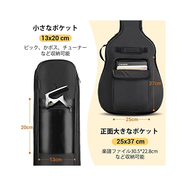 一つの大きなポケット:スマートフォンウォレット、iPad、チューナー、ピック、ストリング、ケーブル、カポスなどのようなアクセサリを収納できる大きな外ポケットがあり、A4と楽譜本なども収納できます。