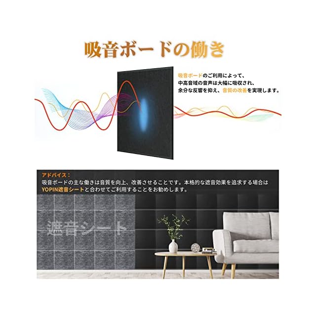 【アドバイス】理想的な吸音効果を得るためには、吸音シートが部屋の壁の70%以上を覆うことを推奨します。また、より良い吸音効果を追求する場合、YOPIN防音材との併用をお勧めします。