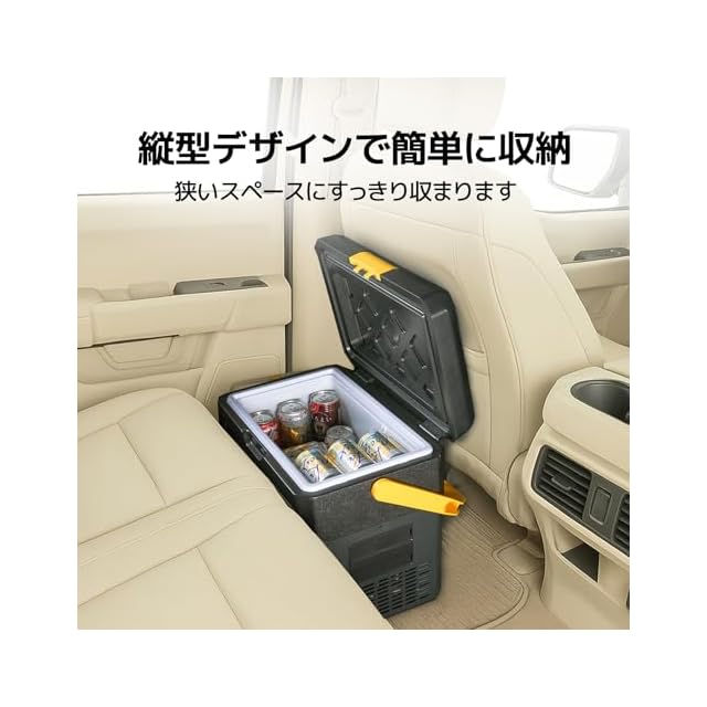 本製品は「防災製品等推奨品マーク」を取得しました。【抜群の携帯性&省スペース設計】 この車載冷蔵庫は、幅約39.5cm×奥行約23.6cm×高さ約44.9cm、重量わずか8.8kgという驚きの軽さとコンパクトさを兼ね備えています。便利なハンドル付きで、片手でラクラク持ち運びが可能!車内での設置場所にも困らず、センターコンソールや助手席、後部座席の間など、限られたスペースにもスムーズに収まり、車内空間を有効活用できます。さらに、冷蔵庫のトップ部分には防滑加工が施されたカップホルダーを搭載。飲み物を置いても滑りにくく、安定感抜群です。キャンプやピクニックといったアウトドアシーンでも安心して使用できる、空間活用と機能性を両立します。