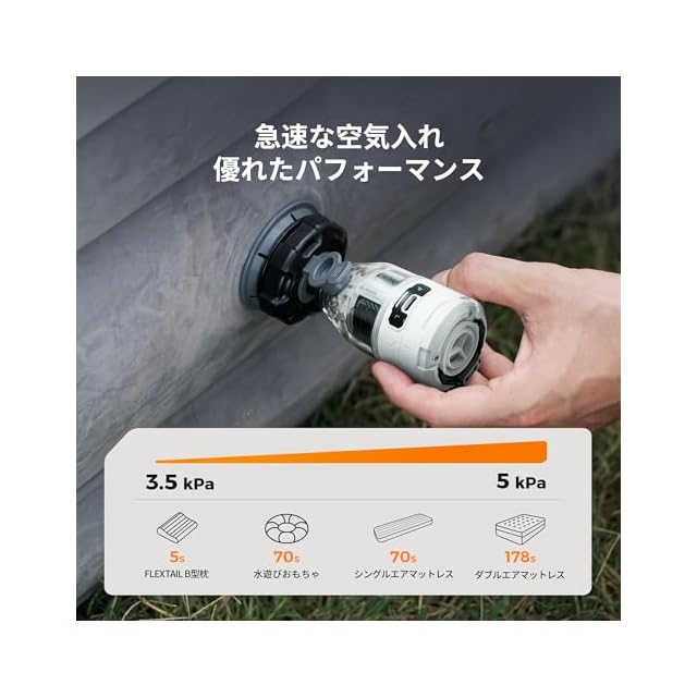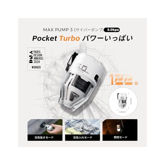 【超小型手持ち式】MAX PUMP 3 電動エアーポンプは僅か122gの軽量で収納や持ち運びにとても便利です。サイズはとてもコンパクトで、ワンボタンスタートおよび手のひらサイズなので子供でも簡単に使用できます。ビーチ、キャンプ、アウトドアに大活躍で使用されます。