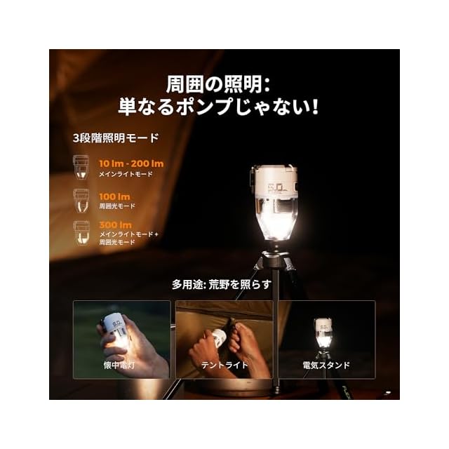 【優れた調光機能】100lmから300lmまでの3段階調光です。進化したMAX PUMP 3は、本体の2/3がライトエリアとなっており、スタイリッシュなデザインもさることながら、アウトドアでより広く、より明るく照らすことが可能です。