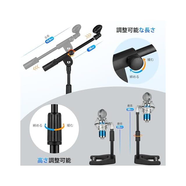 【高品質素材・ハンドヘルド設計】この最大耐荷重4kgのマイクスタンド中心柱の材質はより厚い高品質なスチール材です。さび、破損、変形などの心配はありません。頑丈で、耐久性が優れます。このアップグレードされたマイクスタンドは、伸縮ポールにハンドヘルド設計を採用し、回転させるだけで高さを調整できます、手間がかからず使いやすく、体験が向上します。