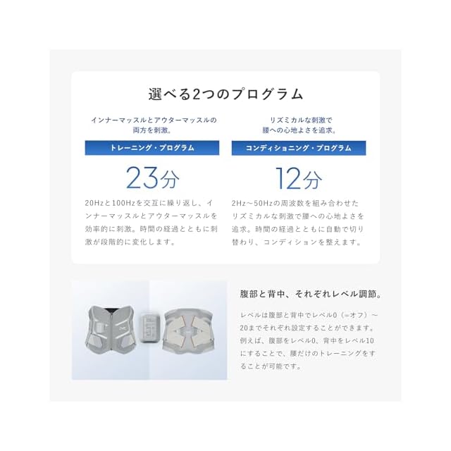【腹部と背中、それぞれレベル調節】レベルは腹部と背中でレベル0(=オフ)〜20までそれぞれ設定することができます。例えば、腹部をレベル0、背中をレベル10にすることで、腰だけのトレーニングをすることが可能です。