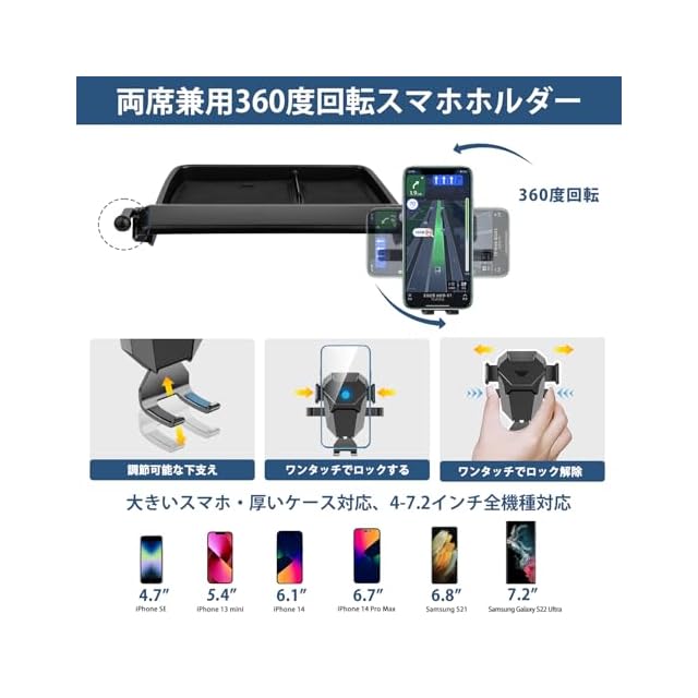 3.【360度回転スマホホルダー付き】:この商品は運転席用のスマホホルダーだけでなく、助手席用の360度回転ホルダーも追加され、スマホ本体を固定する部分は360度回転でき、ロングアームでレバー等の干渉を避け、見やすい位置へ調整可能できます。【幅広い機種対応】ホルダーはコンパクトと機能性を兼ね揃えた車載ホルダーで、 4-6インチのスマホに適用します。iPhone 13 promax /12 promax /11 promax/ iPhone XS MAX / iPhone 8 Plus / 7 Plus / 7 / 6 Plus、または Galaxy S8 Plus / huawei / Xiao Mi / Xperia / Google Pixelなどの機種に対応可能です。(※注意:11 Pro/ iPhone X / XS / XS/iPhone SE / SE 2/iPhone 8/iPhone 6/Galaxy S8などの機種に対応する可能ですが、スマホケースを装着しないスマホには、ご利用の場合、音量ボタンが押されてしまうかもしれません。)