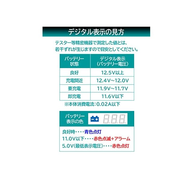 適合バッテリー : [DC12V]国産自動車12Vバッテリー、開放型(オープン)鉛バッテリー(液の補充ができるバッテリー)、密閉型(シールド、メンテナンスフリー)鉛バッテリー、
