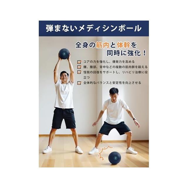 【使用効果 :「1つのボールで全身トレーニング+リハビリも可能】 コア強化:投げる・捻る動作で、腹筋・背筋を効率的に鍛え、姿勢改善に役立ちます。 爆発力UP:野球・格闘技のトレーニングに最適。瞬間的なパワーを高めます。 リハビリ支援:腰や肩の痛みがある方でも、軽い重量で安全に可動域を広げられます。 バランス力向上:不安定な動きで体幹が自然に強化され、転倒防止にも。