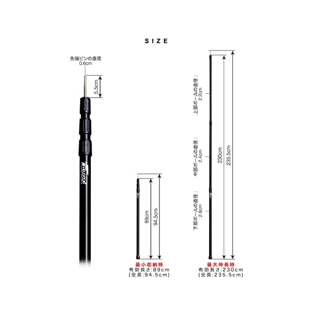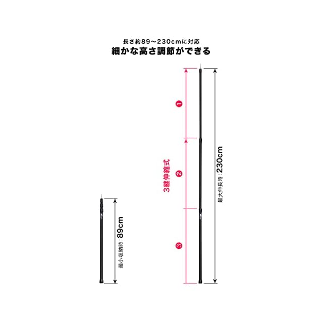 ✅【細かな高さ調節ができる】 3つのシャフトを重ねた3継無断階調節式を採用。高さは89~230cmの間でお好みの高さに設定できます。また収納時もコンパクトに収まるので持ち運びラクラク!