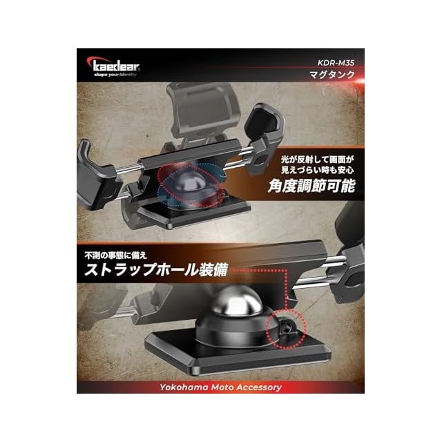 Kaedear(カエディア) バイク スマホホルダー マグネット アルミニウム合金 CNC 携帯ホルダー バイク用スマホホルダー 強力 ネオジウム 磁石 全面マグネット 角度調整 ボールジョイント 深いアームでホールド力倍以上 左右対向アーム 傷防止 プロテクションフィルム 付属 マグタンク KDR-M35