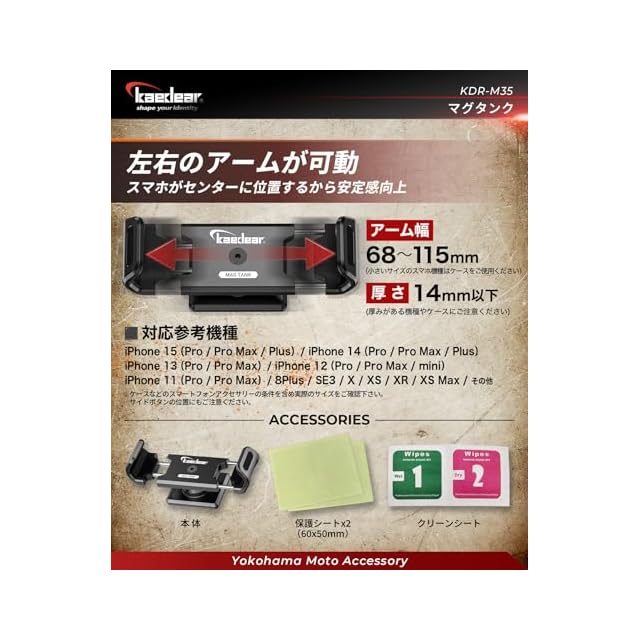 【商品仕様】 ■サイズ:アーム幅68~115mm、厚さ14mm以下 ■材質:アルミニウム合金+ステンレス鋼+シリコーン ■重量:136g ■内容:プロテクションフィルム(60mmx50mm)、クリーニングシート ■取扱説明書(オンラインのみ):環境負荷の軽減を目指した脱炭素化への取り組みとして、紙媒体での同封を控えさせていただいております。Kaedear公式サイトの各商品ページから閲覧またはダウンロードが可能です。 ■ブランド:Kaedear( カエディア ) ※予めスチール製のタンクである事を磁石等を活用しご確認ください。 ※万一に備え、セーフティーストラップKDR-SFB-S、カラビナなどを活用し、ホルダーセット後にスマホとホルダー(ストラップホールあり)をそれぞれ車体に繋げる事で不測の事態に備える事をおすすめしています。