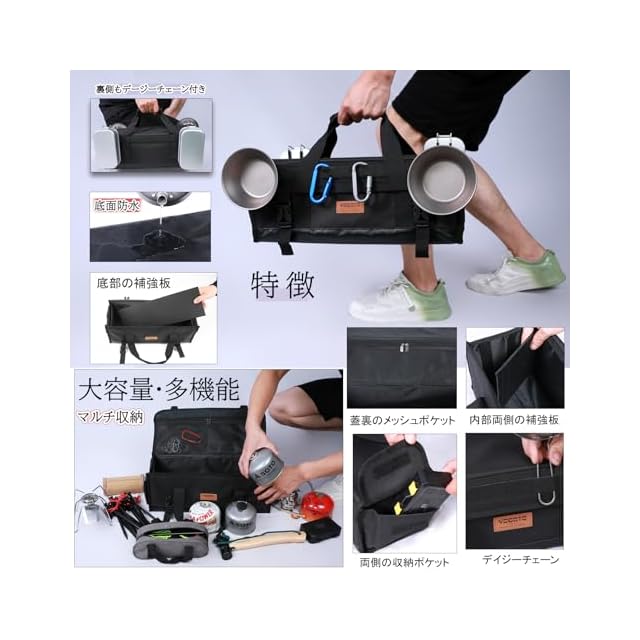 第2世代収納ボック:底面に防水素材を採用し、濡れた地面に直置き可能。ペグ30cm、ペグ40cm、バーナー、キャンプ用調理器具、ハンマーなど、様々なキャンプ用品を一括収納。蓋の裏側、外側の両サイドにポケットがあり、キャンプ小物を収納するのが便利。