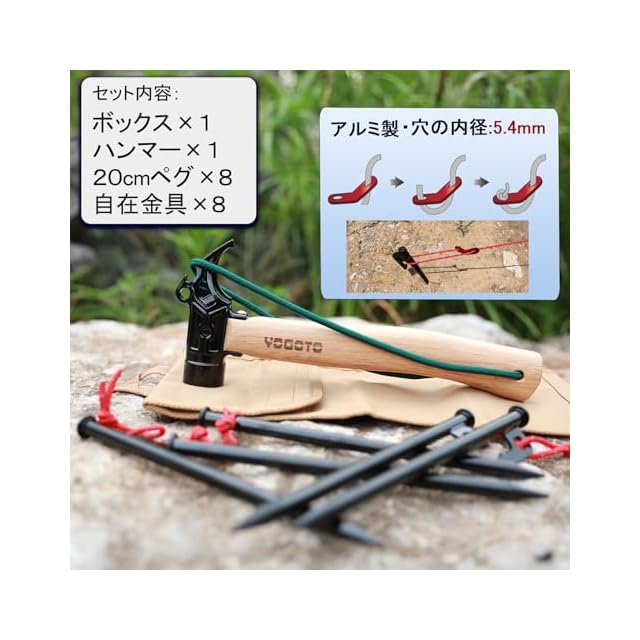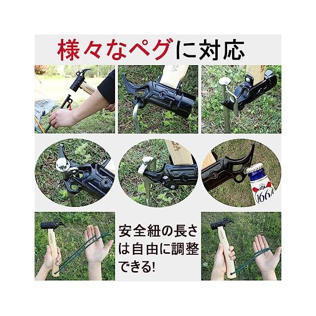 ハンマー:大きな打撃面はペグを簡単に地面に打ち込めます。ペッグ抜きに頭部にはホールとフックの2種類を備え、初心者にも使えやすいです。また、栓抜きとして使える。
