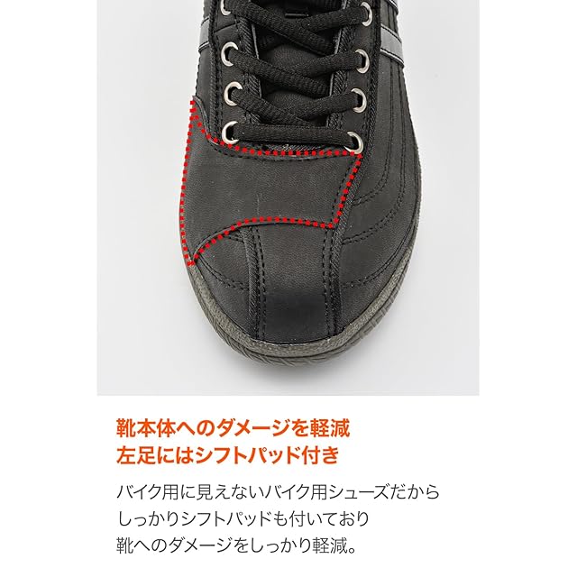 【仕様1】安全靴同等レベル(JIS規格S級相当)の耐衝撃性能を備えた鉄芯をシューズ先端部に内蔵することで、バイクと地面に挟まれた際の安全性を向上させました