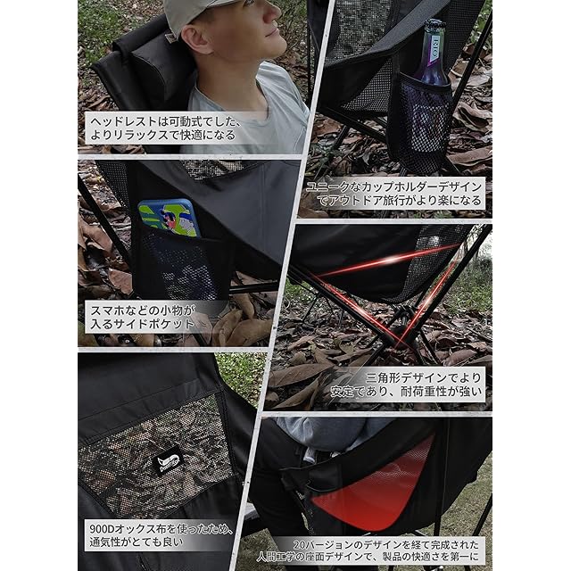 ✅【優れる耐久性と通気性】 アウトドア椅子は800Dポリエステルを採用した座面とメッシュの設計で、あつい季節も蒸し暑くなく、抜群の通気性と快適な座り心地を確保できます。座面の裏も防水加工し、雨でもタオルでちょっと拭くだけ座れます。さらに、座面を深くするし、ハンモックのように体にフィットし、ゆったりと包み込まれる座り心地を実現したレジャーチェアです。