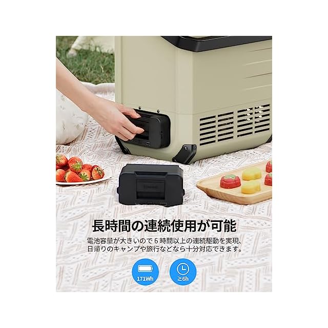 【大容量バッテリーで長時間使用可能】171Whの大容量で6時間以上の連続駆動を実現、デイキャンプや日帰りの旅行等なら十分対応できます。また、別売のソーラーパネルによる太陽光充電も可能、連泊のキャンプでも電池切れの心配がありません。