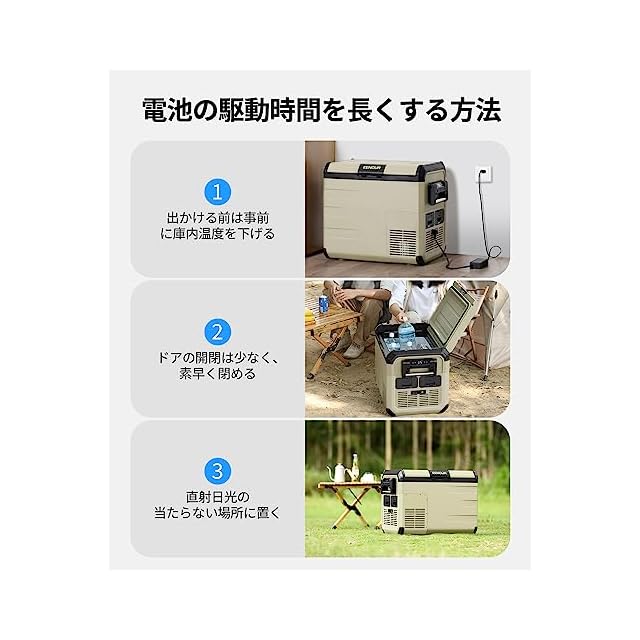 【バッテリー駆動に自動で切り替える】車載用として使う場合は、停車時には自動的にバッテリー駆動に切り替わり、庫内を冷やし続けられるので使い勝手抜群です。過電流保護、過充電防止などの保護回路も内蔵されているので、安心してご利用いただけます。