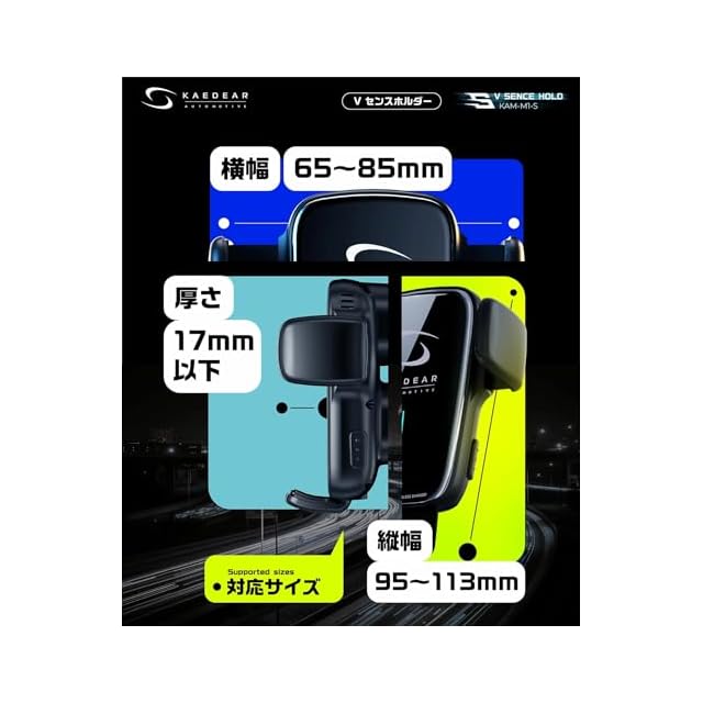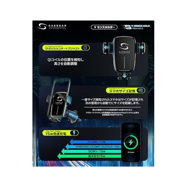 【取り付け】エアコンフックタイプ:車両のエアコン吹き出し部に固定。 ゲルマウントタイプ:ダッシュボード等の平面に固定。 【商品内容】 ■内容:Vセンスホールド本体、エアコンフック、ゲルマウント、吸盤基台、USBケーブル■入力:USB(タイプC)5V3A/9V3A/12V2A以上の出力USBをご使用下さい。 ■出力:5W/10W/15W(QI認証済) ■材質:ABS、耐火PC、2.5D強化ガラス ■スマートフォンサイズ:4.5-6.8インチ 【縦幅95-113mm横幅65-85mm厚さ17mm以下】■ブランド: Kaedear Auto Motive ( カエディア オートモティブ )■ご注意:初回は電源が安定するまで動作する事ができません。電源を投入後1~2分お待ち下さい。