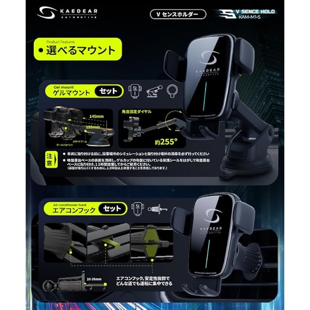 Kaedear auto motive(カエディアオートモーティブ) 車 スマホホルダー ワイヤレス充電 自動開閉 QI高速充電 車載ワイヤレス 充電器 車載ホルダー 充電位置自動検知 オートアジャスト機能 スマホスタンド 吸盤 タイプ & エアコンフック 車用スマホホルダー Vセンスホールド KAM-M1S