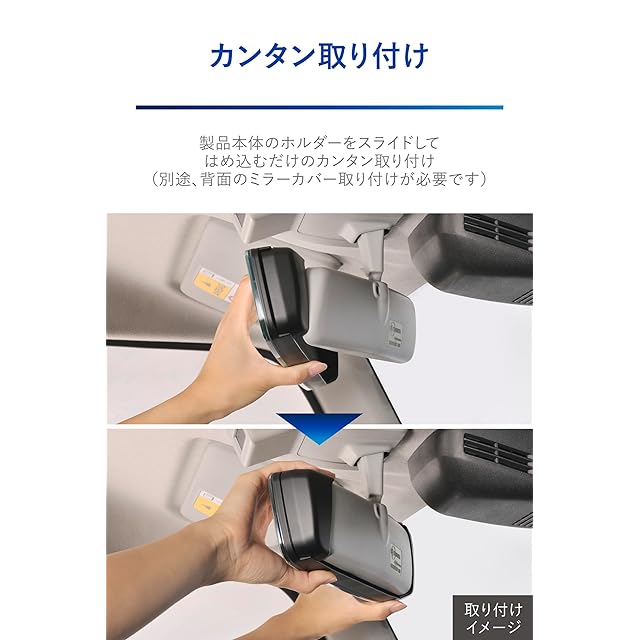 ●カンタン取り付け 製品本体のホルダーをスライドして、はめ込むだけのカンタン取り付け。取り付け所要時間:10秒(別途、背面のミラーカバー取り付けが必要です。取り付け所用時間:2分)